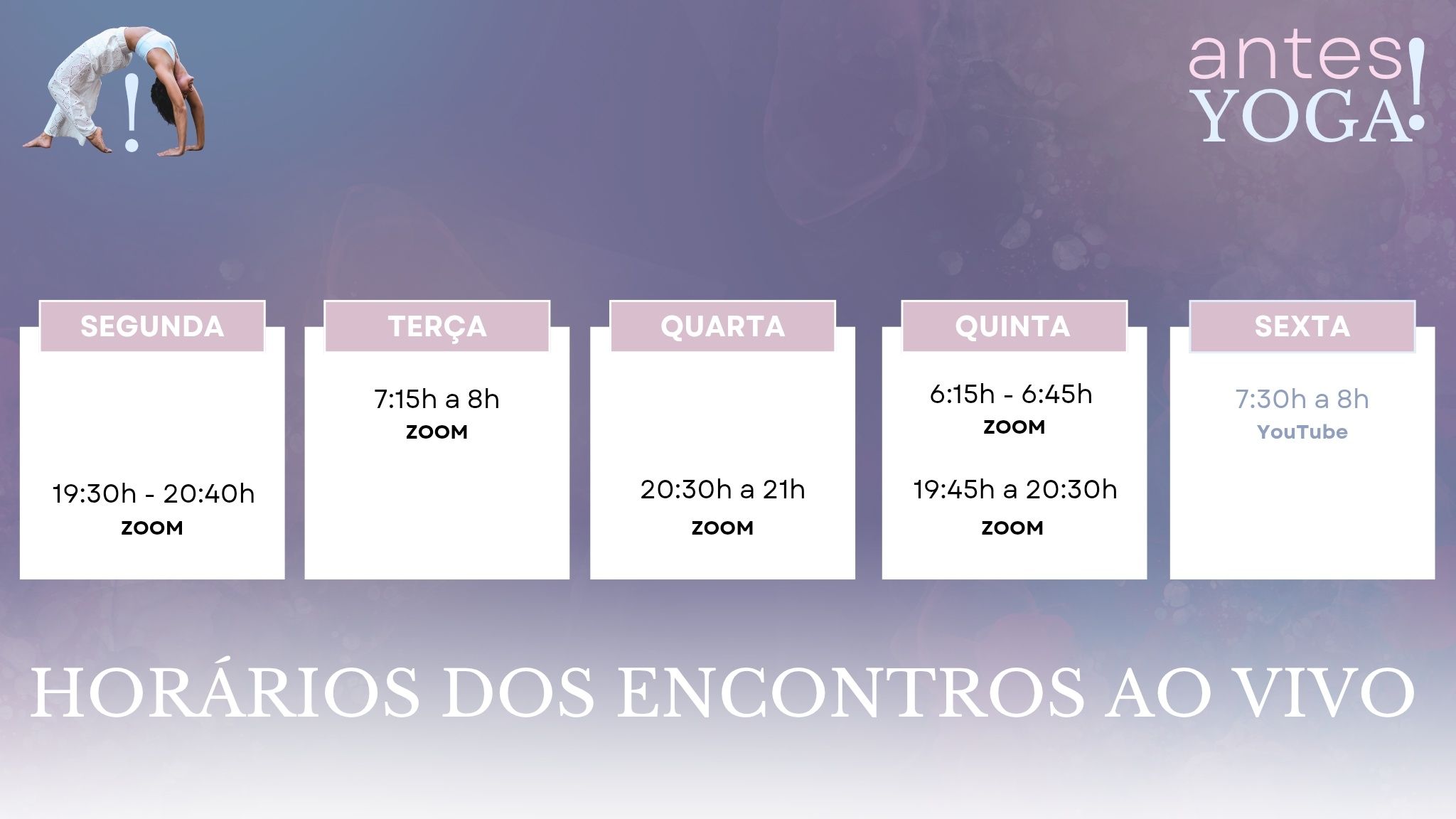 As aulas do "Antes, YOGA!" acontecem ao VIVO, mas sua gravação fica disponível para a prática posterior. As alunas têm ainda acesso a uma um grupo exclusivo no whatsapp, para tornar seu aprendizado mais completo e efetivo.